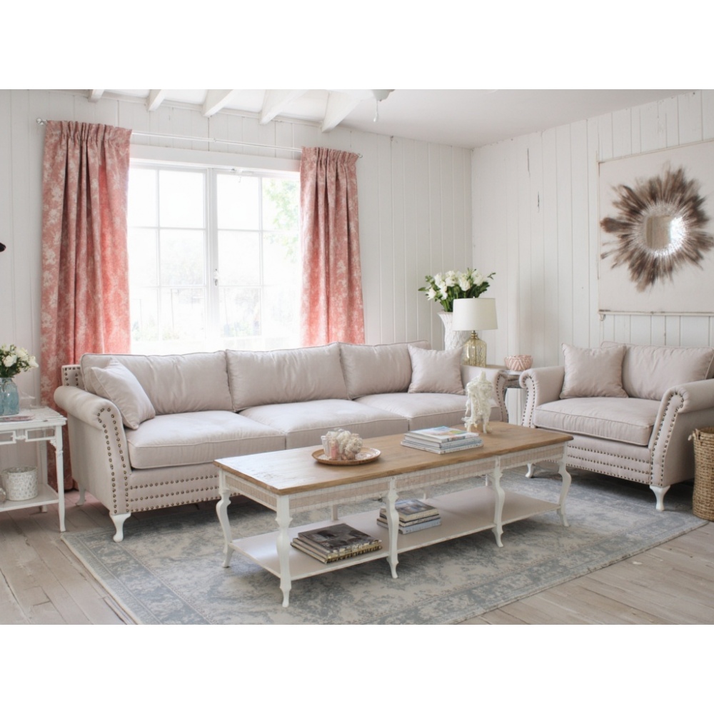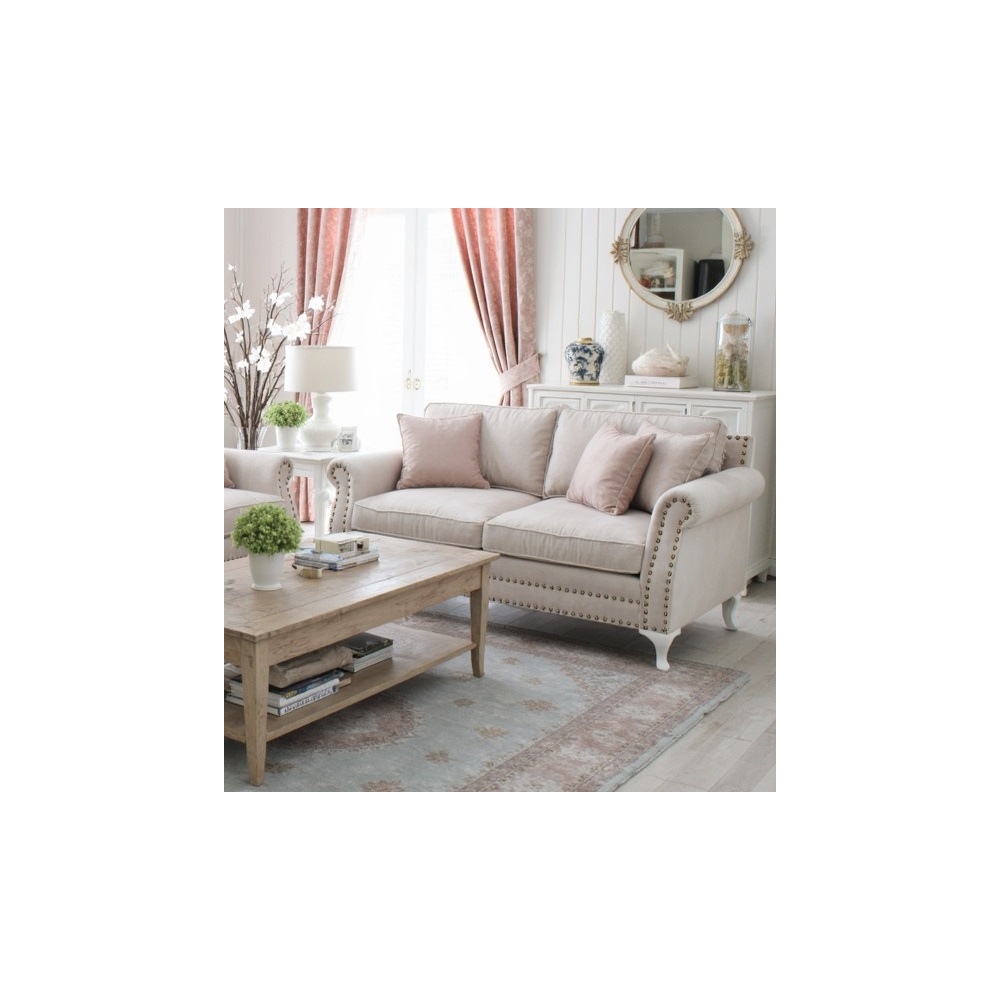 Charakterystyczne dla modelu Lori zaokrąglone podłokietniki oraz ozdobne ćwieki nadają fotelowi wyrazistego charakteru, wpisując go w estetykę stylu cottage i klasycznego glamour. Jasna tapicerka pięknie współgra z drewnianymi akcentami i pastelowymi dodatkami, tworząc atmosferę ciepła i harmonii.