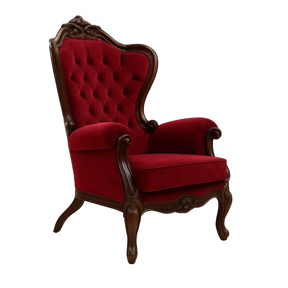 Wytworny fotel Naxos to połączenie klasycznej elegancji i domowego ciepła. Jego kunsztownie rzeźbione drewniane nogi oraz pikowane oparcie w stylu Chesterfield nadają mu wyjątkowy charakter. Miękkie siedzisko i wyprofilowane podłokietniki gwarantują pełen komfort, a aksamitna tkanina w głębokim, nasyconym kolorze dodaje wnętrzu szlachetności.