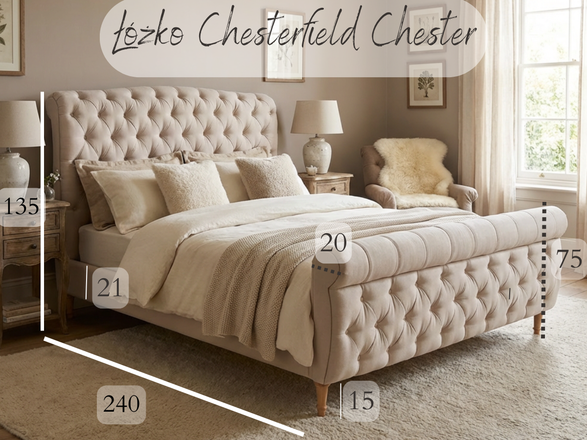 Konstrukcja została osadzona na toczonych nóżkach z litego drewna w naturalnym odcieniu, co stanowi subtelny ukłon w stronę tradycyjnego rzemiosła. Dzięki nim cała, dość masywna bryła zyskuje niezbędny dystans od podłogi i odrobinę lekkości. Łóżko Chester fantastycznie czuje się w towarzystwie puszystych dywanów, lnianych narzut i drewnianych szafek nocnych w stylu ludwikowskim lub rustykalnym, tworząc przestrzeń, w której każdy wieczór staje się chwilą wyjątkowego relaksu.