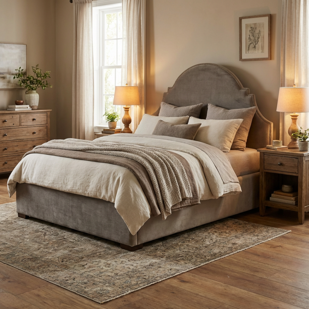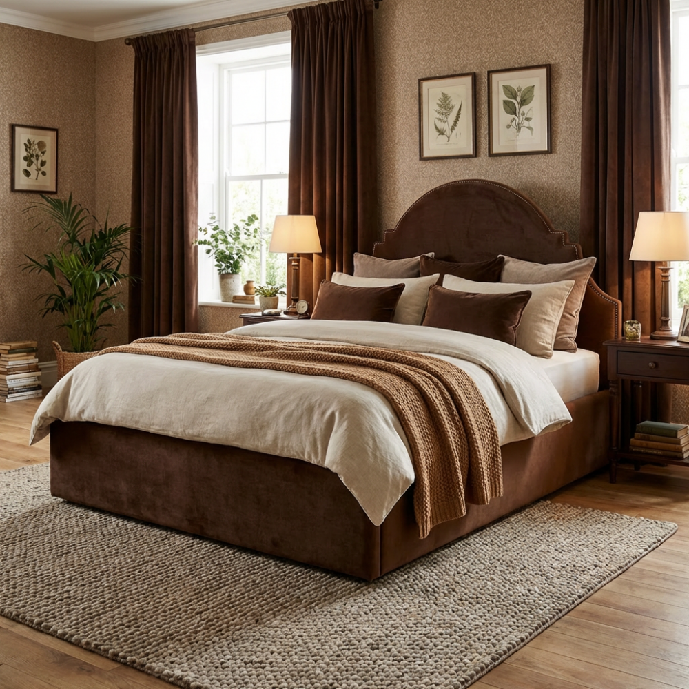To, co wyróżnia model Sisi na stronie meblefox.com, to głęboka, czekoladowa barwa welurowej tapicerki. Welur jest materiałem, który w wyjątkowy sposób współpracuje ze światłem, nadając meblowi szlachetnego połysku i sprawiając, że sypialnia staje się bardziej nastrojowa. Ten ciepły odcień brązu fantastycznie komponuje się z naturalnymi dodatkami – lnianą pościelą, wełnianymi narzutami czy drewnianymi meblami nocnymi, tworząc harmonijną całość w duchu modern classic lub stylu prowansalskiego.