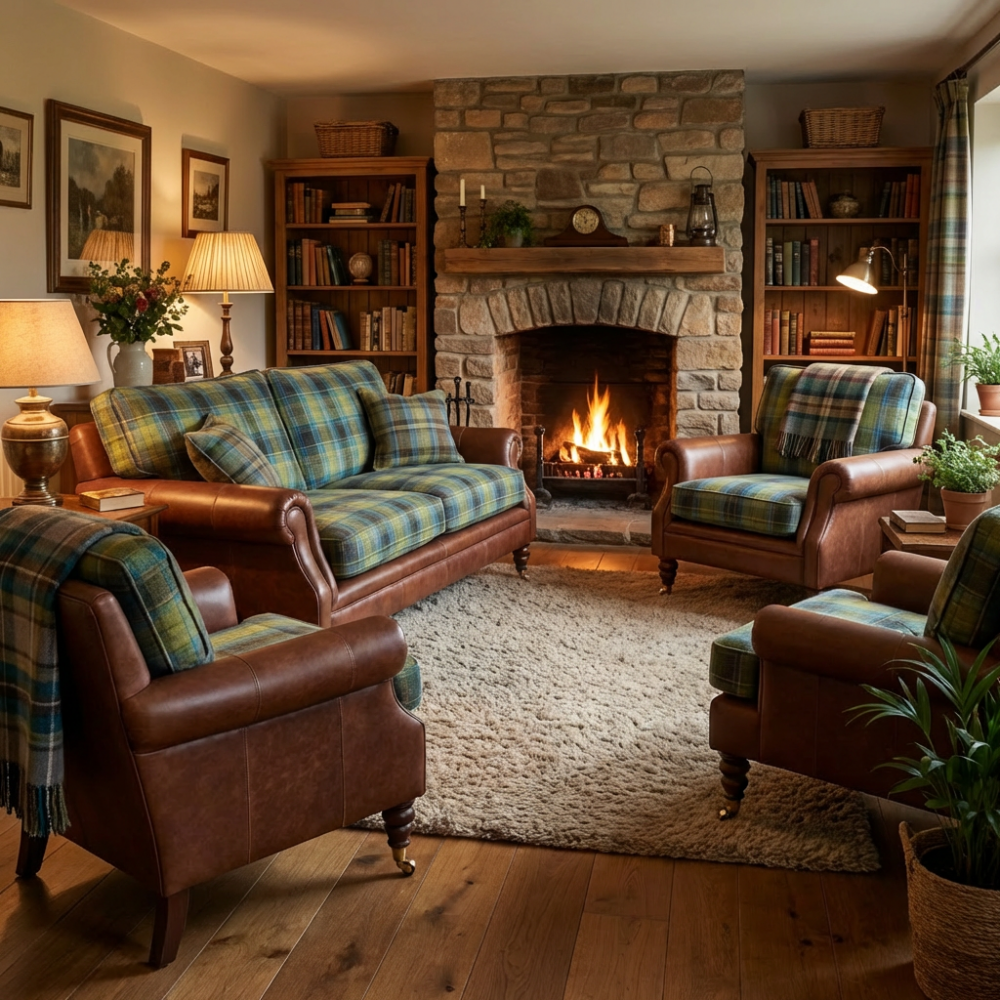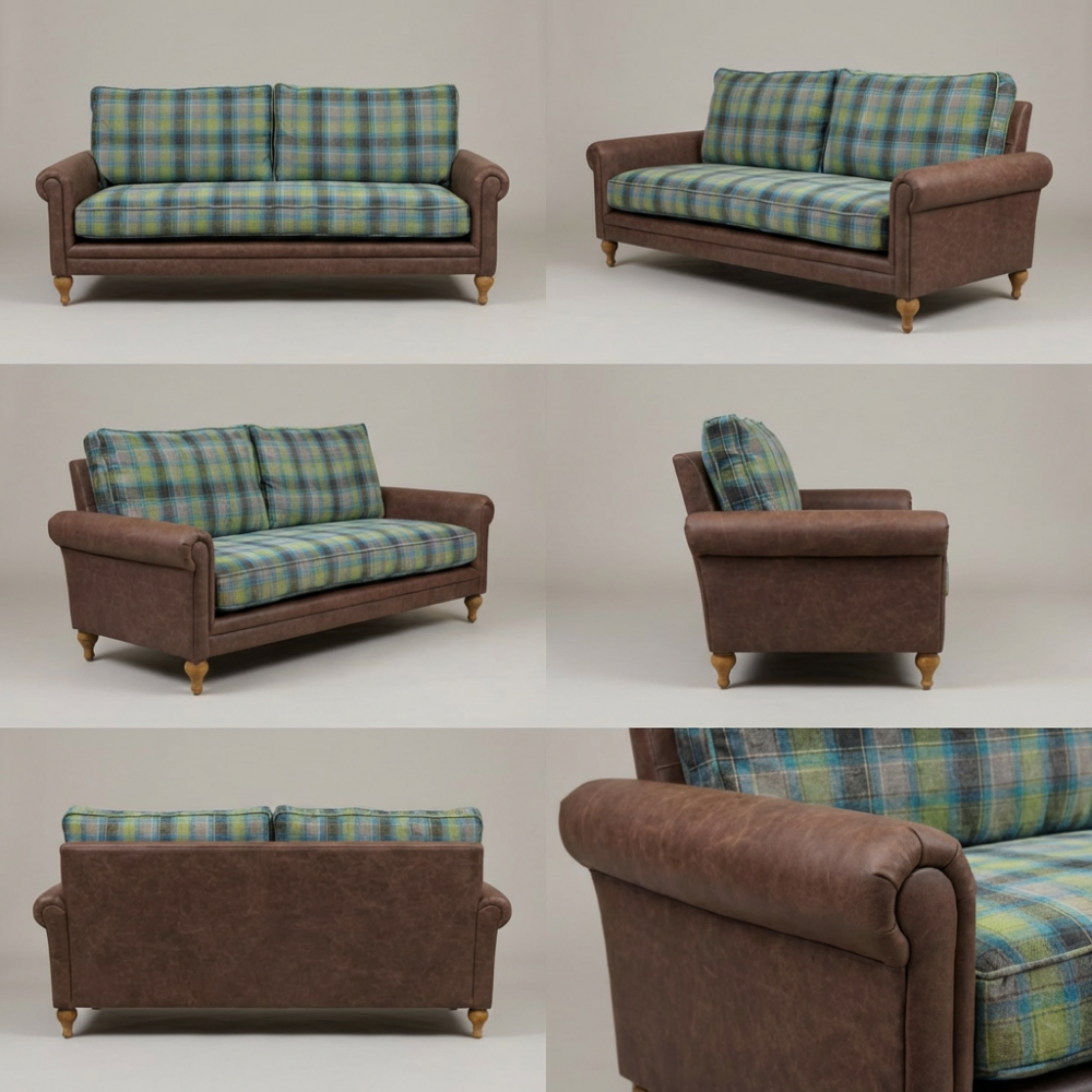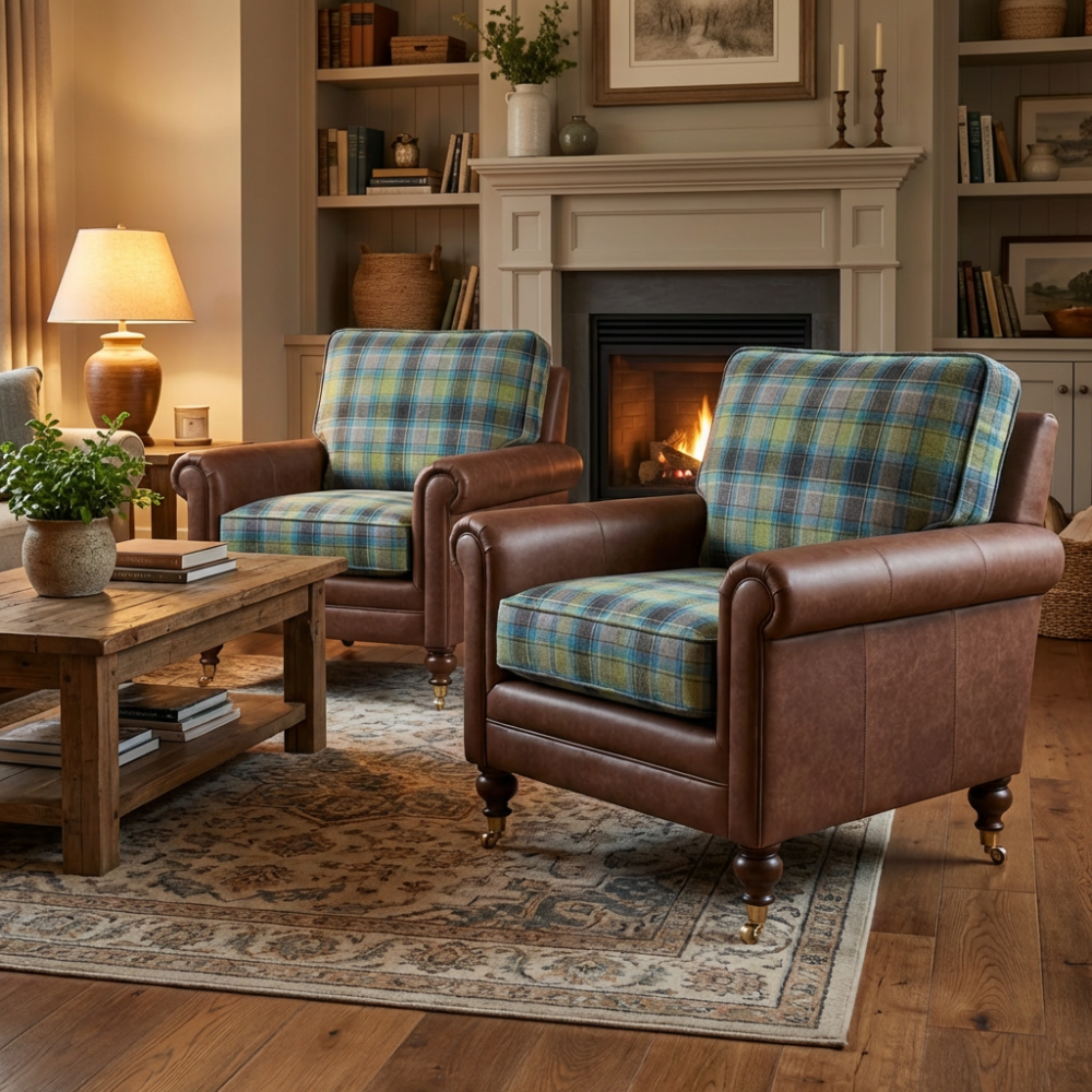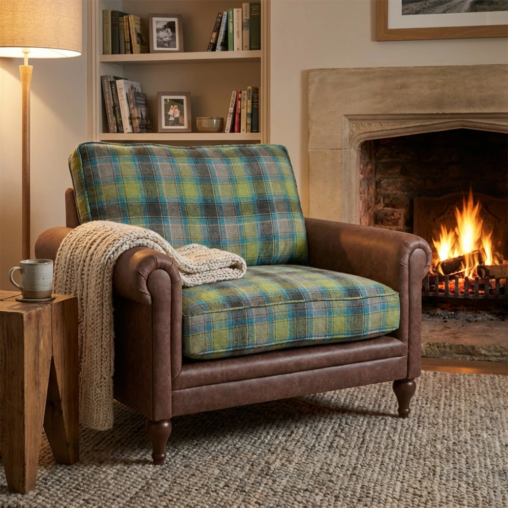 To, co definiuje charakter modelu Sherlock dostępnego na meblefox.com, to mistrzowskie zestawienie materiałów. Korpus fotela oraz charakterystyczne, zaokrąglone podłokietniki zostały obite szlachetną skórą woskowaną w odcieniu głębokiego brązu. Skóra ta jest niezwykle miła w dotyku i posiada naturalną zdolność do szlachetnego starzenia się, z czasem nabierając unikalnej patyny. Kontrapunktem dla gładkiej skóry jest siedzisko i oparcie wykonane z tkaniny Glasgow w tradycyjną kratę. Połączenie morskiej zieleni, błękitu i ciepłych brązów sprawia, że fotel staje się wyrazistym, a zarazem kojącym akcentem w każdym wnętrzu.