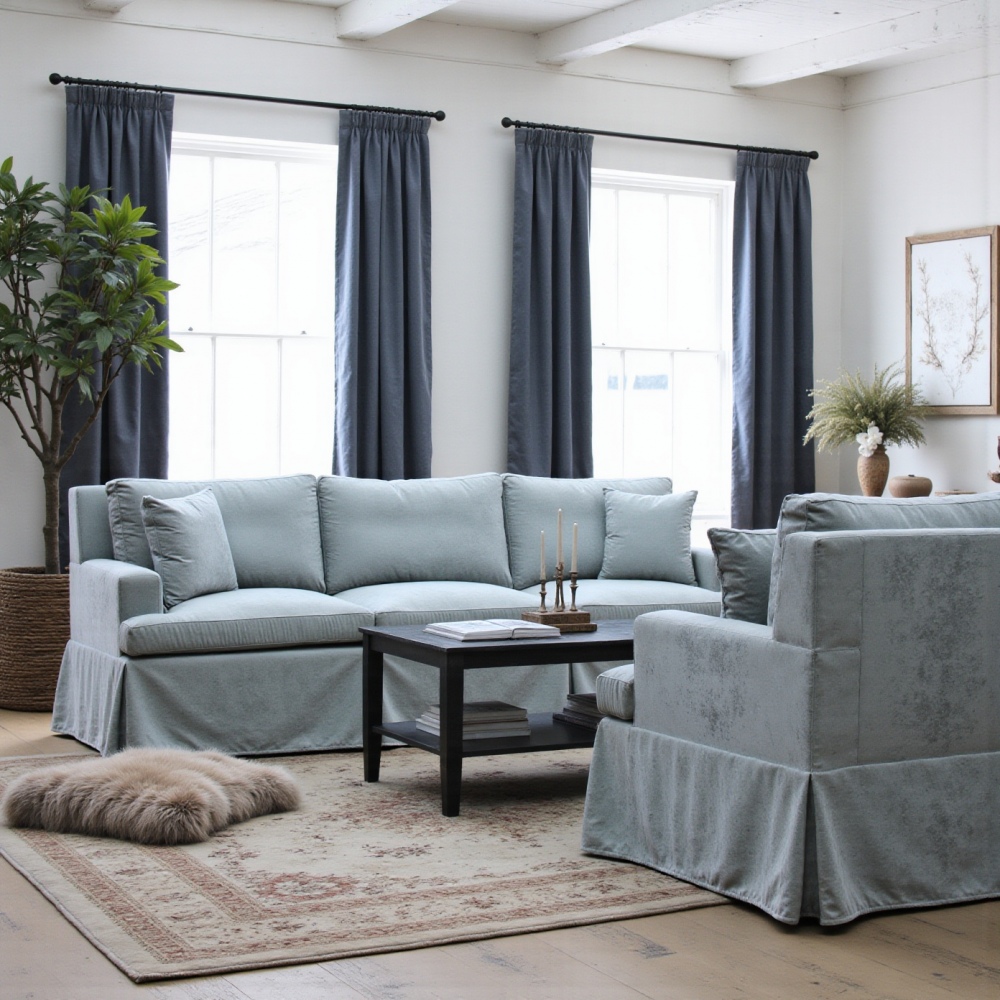 Obie kanapy w zestawie oferują głębokie, miękkie siedziska, które zapewniają wyjątkowy komfort podczas wypoczynku. Wysokie oparcia i delikatne, subtelne poduszki sprawiają, że korzystanie z nich to prawdziwa przyjemność. Dodatek w postaci dekoracyjnych falban nadaje meblom wyjątkowego charakteru, który z łatwością wpisuje się w styl Hamptons, idealnie komponując się z drewnianymi i naturalnymi dodatkami.