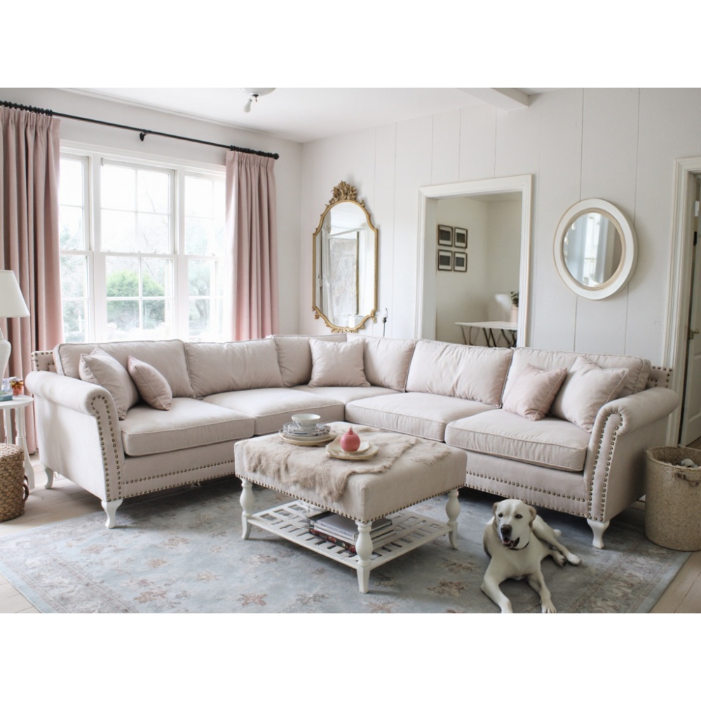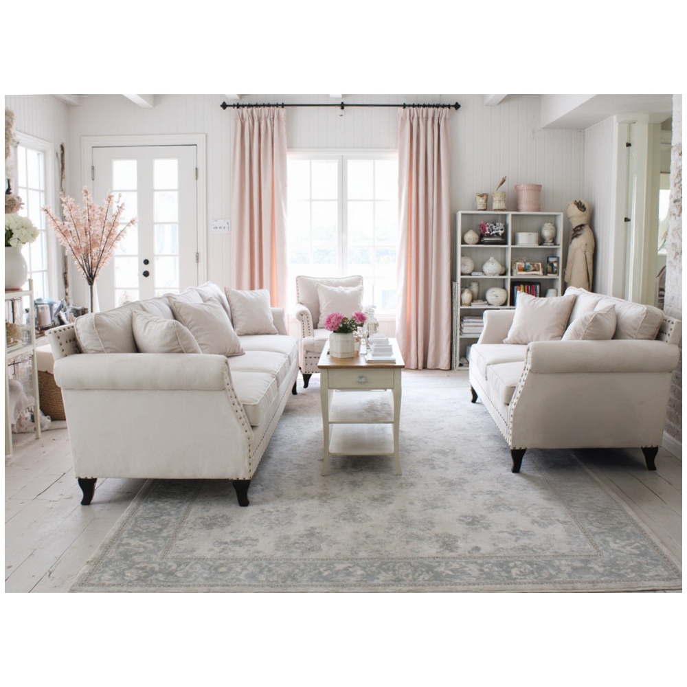 Obie sofy wchodzące w skład zestawu zostały obite przyjemną w dotyku, jasną tkaniną o dużej odporności na codzienne użytkowanie. Subtelne detale, takie jak wygięte nogi i pikowania podkreślone ćwiekami, dodają całości charakteru, bez przytłaczania wnętrza. Całość doskonale współgra z pastelową paletą barw.
