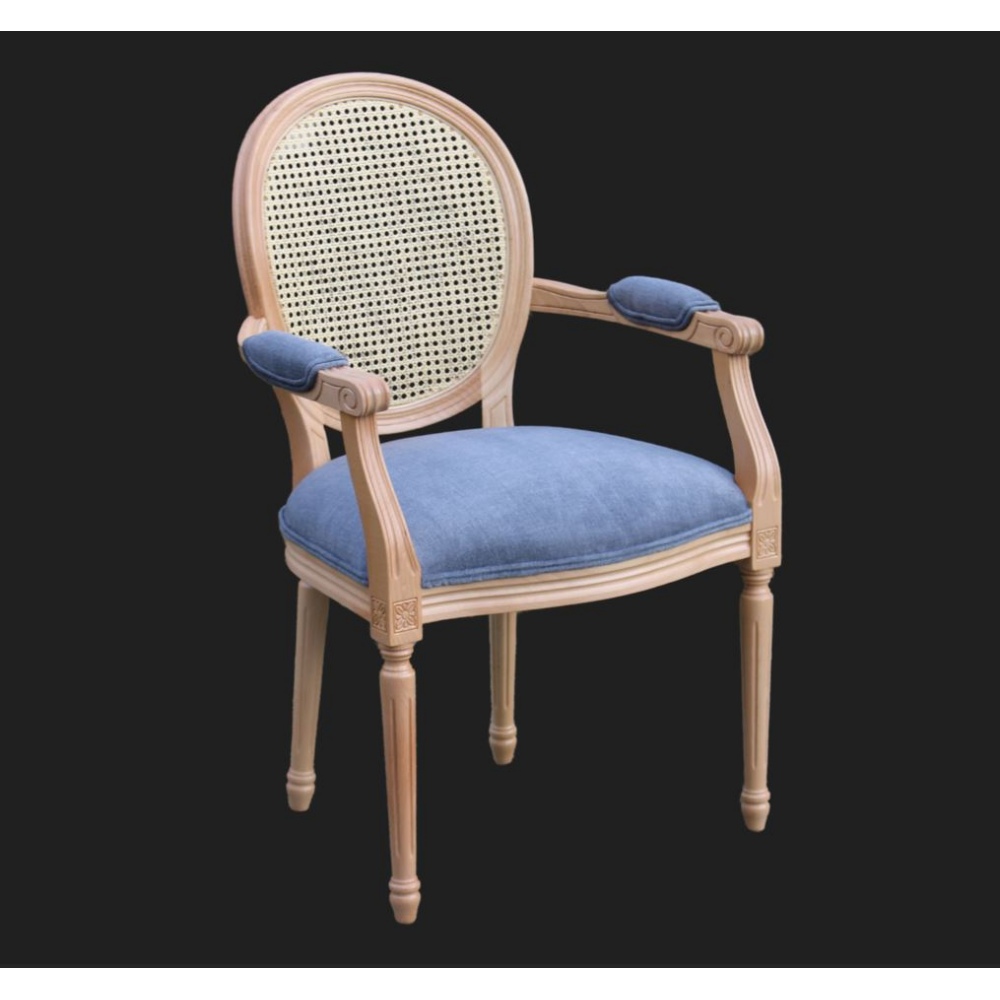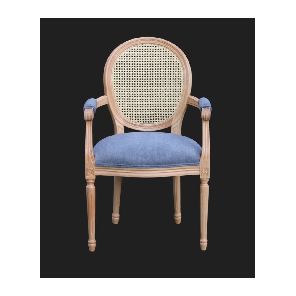 Miękkie siedzisko obite wysokiej jakości tkaniną w odcieniu klasycznego błękitu dodaje meblowi uroku i wyjątkowości. Materiał jest trwały, łatwy do utrzymania w czystości, a jednocześnie bardzo przyjemny w dotyku. Dodatkowym akcentem są tapicerowane podłokietniki, które zwiększają komfort i elegancję krzesła, pozwalając na pełny relaks podczas siedzenia.