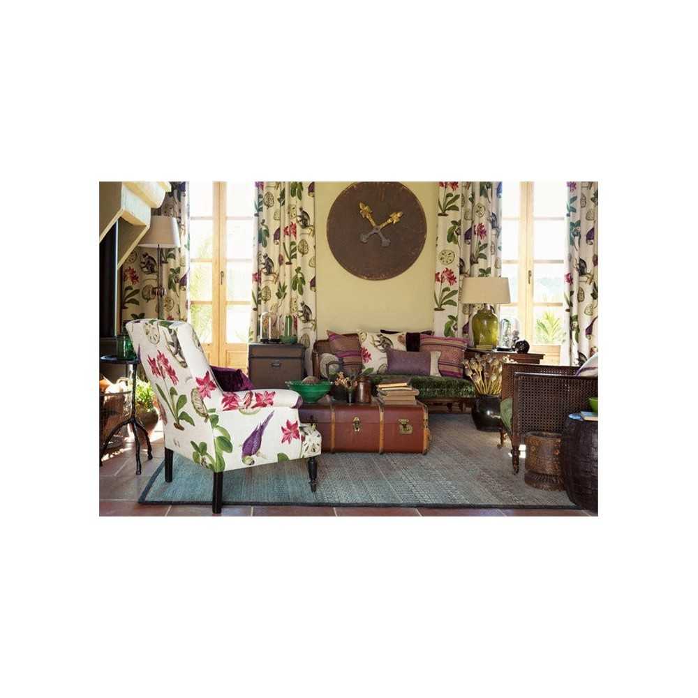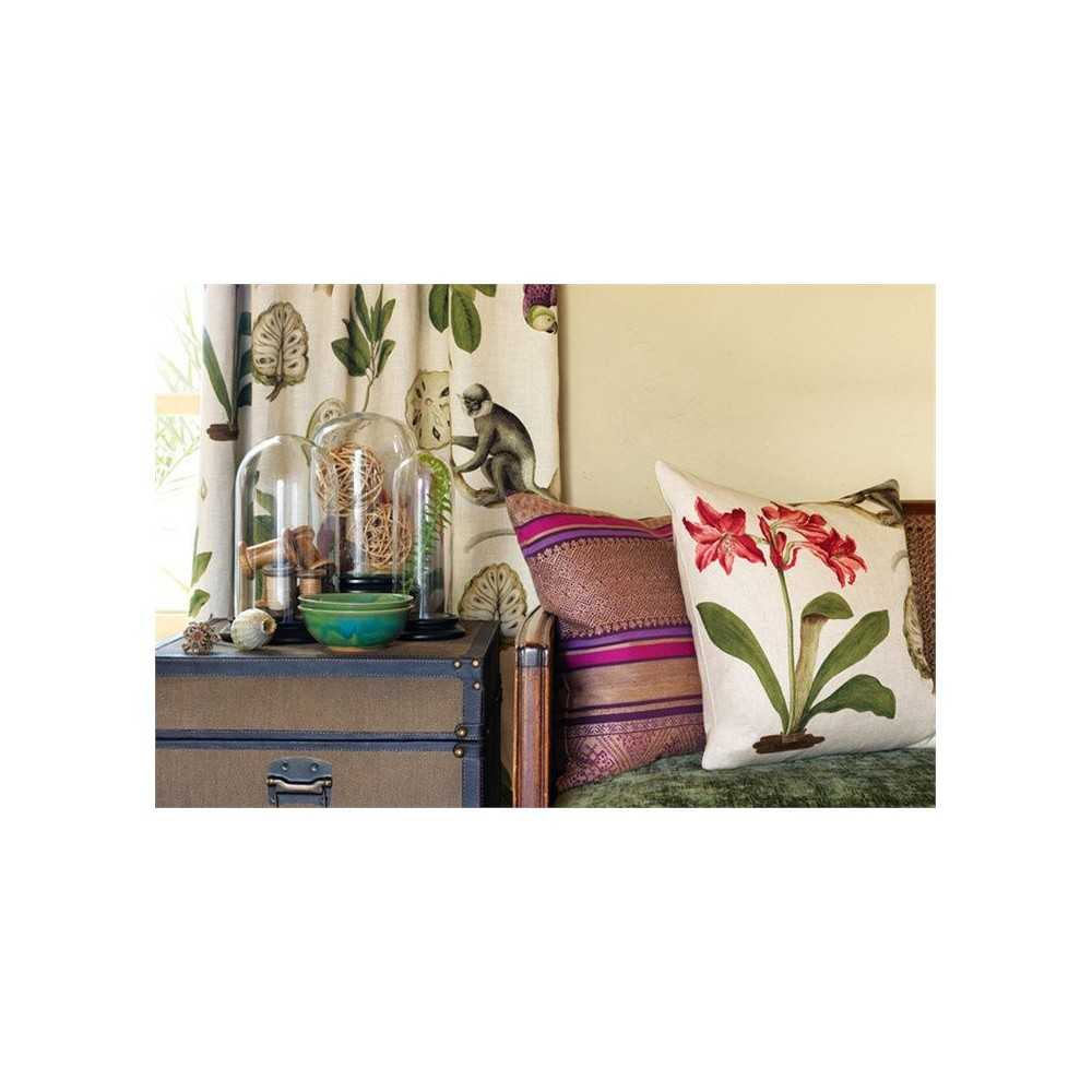 Prezentujemy wspaniałą tkaninę połączenie wiskozy z naturalnym lnem, usiana ciekawym wzorem zwierząt i roślin. To jak podróż do lasów tropikalnych, gdzie możemy spotkać Małpki Kapucynki oraz Papugi Ara, owoce pigwowca oraz roślinność lasów Amazonii. Bardzo duży wzór pozwala na ciekawe aranżacje zasłon, czy poduszek dekoracyjnych. A fotel, czy sofa uszyte w tej tkaninie zapewne zachwycą niejednego gościa o dobrym guście.