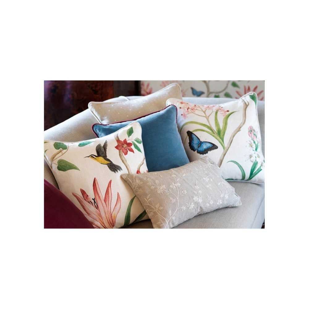 Przepiękne połączenie roślin i zwierząt, swoistego rodzaju drzewo życia spięte pięknymi kolorami. Drobne liście i kwiaty, motyl i koliber cała historia zawarta na kawałku materiału. Cztery wersje kolorystyczne pozwalają na dobranie odcieniu dokładnie do wymagań dekoratora. Połączenie wiskozy z lnem idealnie nadaje się na tapicerkę meblową, zasłony czy poduszeczki dekoracyjne.
