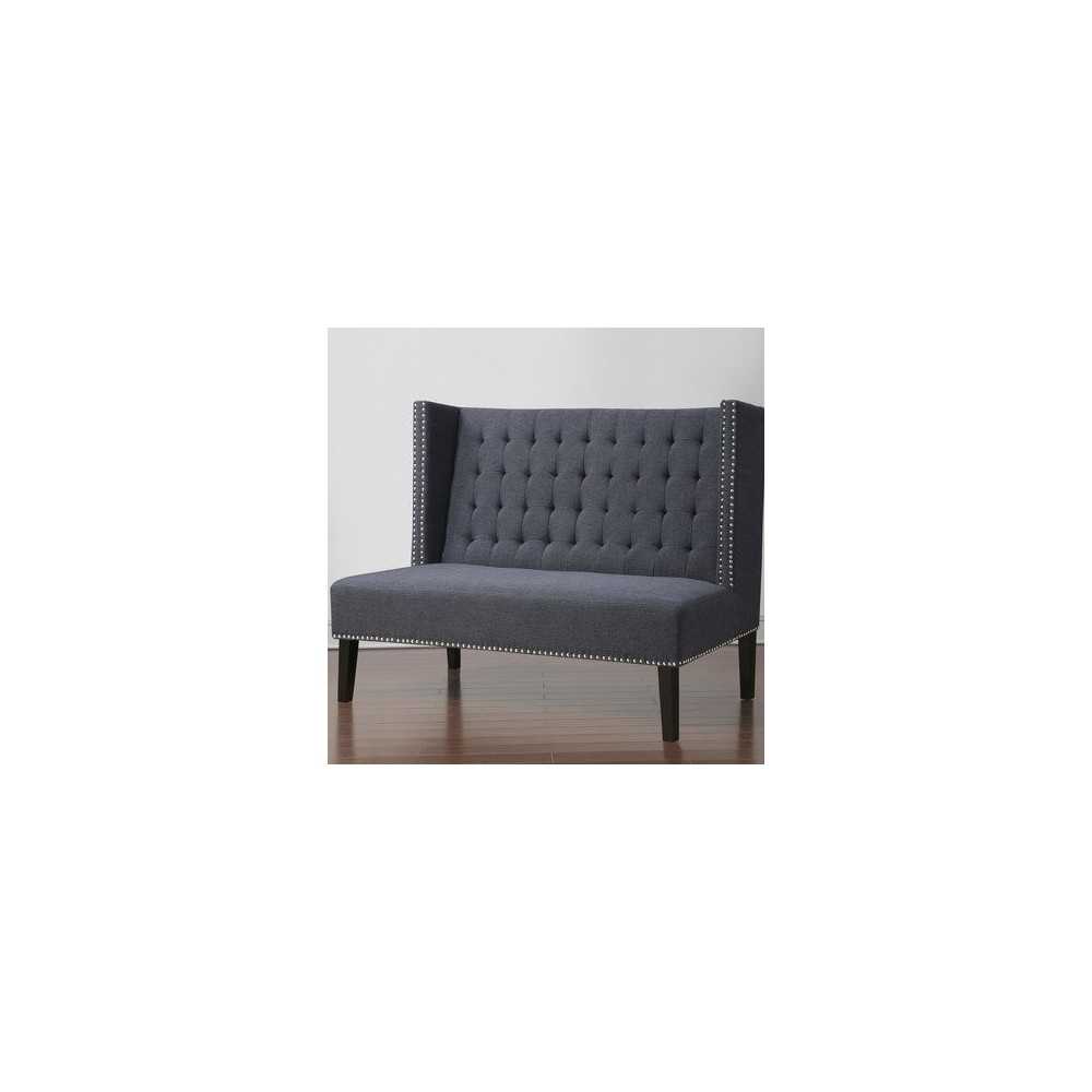 Mebel ma całkowitą szerokość 140 cm i wysokość 104 cm. Nie ma podłokietników, a jedynie podwyższane pikowane oparcie, które z dwóch stron ograniczają krótkie panele. Od frontu są nabijane ozdobnymi pineskami, podobnie jak spodnia część skrzyni. Bezpośrednio od niej wychodzą cztery proste nóżki w kontrastowym ciemnym kolorze, które budują wrażenie dynamizmu i świeżości.
