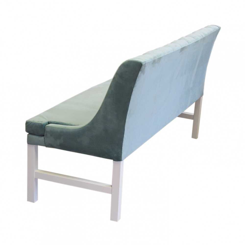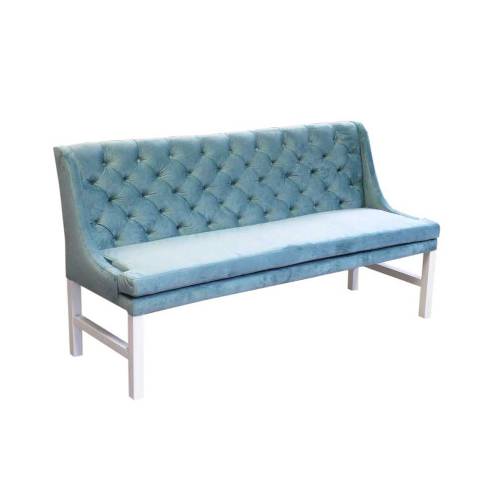 Sam kształt ławki jest klasyczny. Oparcie w kształcie prostokątnego panelu zdobi bogate pikowanie z powlekanymi guzikami w kolorze tapicerki. Harmonijnym zwieńczeniem projektu są nóżki, które zostały dodatkowo wzmocnione poprzecznym elementem. Do ich produkcji wykorzystano solidne i estetyczne drewno bukowe barwione na jasny odcień. Może on harmonizować z odcieniem tapicerki lub stanowić punkt kontrastowy. Nóżki są wysokie i wraz z siedziskiem i oparciem mają 90 cm.
