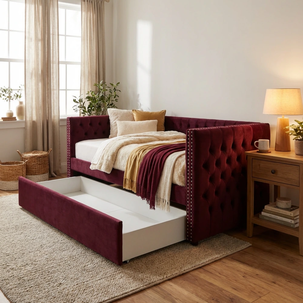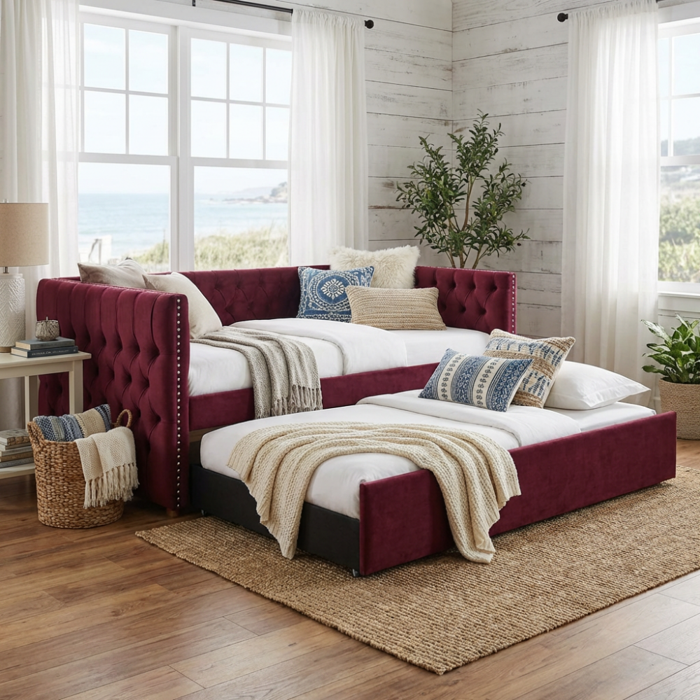 Jeśli szukasz mebla, który połączy luksusowy design z praktycznymi rozwiązaniami, łóżko Rubin w głębokim bordowym odcieniu to strzał w dziesiątkę. Jego klasyczna, pikowana forma w stylu chesterfield od razu przyciąga wzrok i nadaje sypialni wyjątkowego, niemal pałacowego sznytu. Wyrazisty kolor tapicerki w połączeniu z aksamitną teksturą weluru sprawia, że wnętrze staje się niezwykle przytulne, a jednocześnie pełne elegancji. To idealny wybór dla tych, którzy chcą, by ich sypialnia była miejscem z duszą i charakterem.