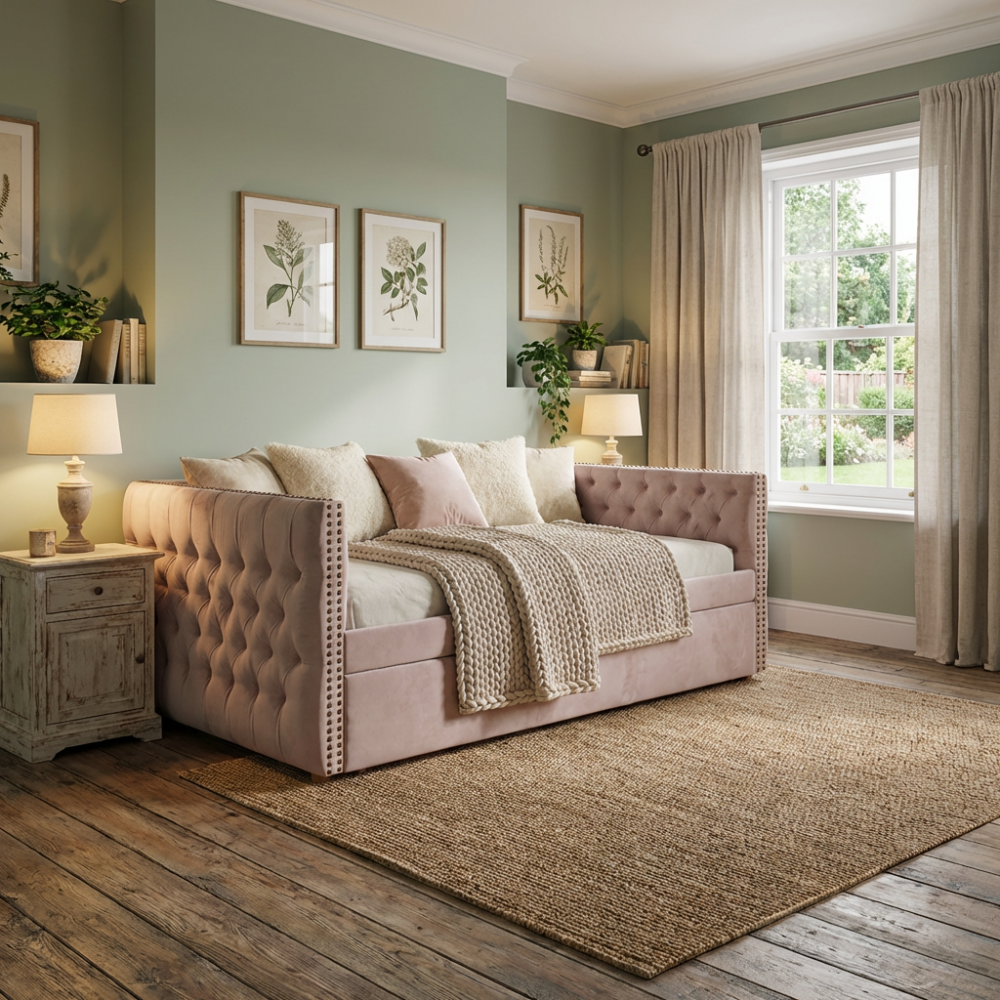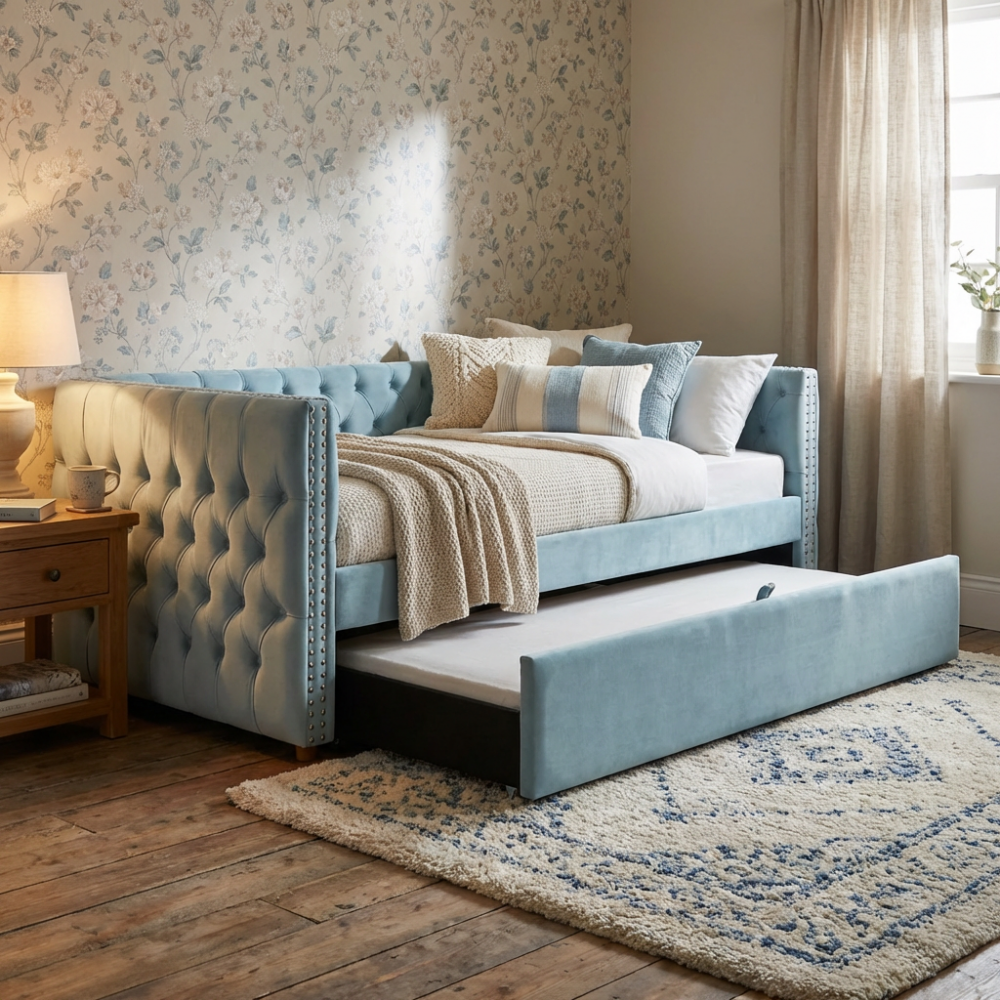 Kunsztowne pikowania na oparciach oraz ozdobne pineski tapicerskie biegnące wzdłuż bocznych krawędzi to dowód na rzemieślniczą precyzję wykonania. Wysokie boki i tył łóżka sprawiają, że mebel świetnie pełni też rolę wygodnej sofy w ciągu dnia. Wystarczy kilka ozdobnych poduszek, by stworzyć komfortowy kącik do czytania czy relaksu. Solidna konstrukcja gwarantuje, że łóżko będzie cieszyć oko i służyć domownikom przez długie lata.