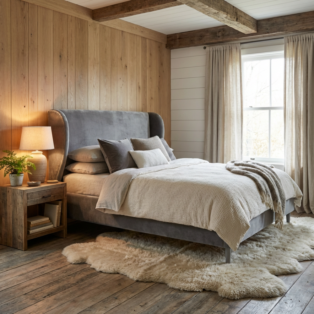 Konstrukcja łóżka została osadzona na smukłych, drewnianych nóżkach o lekko stożkowatym kształcie. Ten detal nadaje bryle lekkości, sprawiając, że łóżko mimo swojej solidności nie przytłacza wnętrza. Dzięki uniesieniu ramy nad podłogę, sypialnia wydaje się bardziej przestronna, a Ty zyskujesz łatwiejszy dostęp do utrzymania czystości pod meblem. Model ten idealnie odnajduje się w towarzystwie lnianych narzut, puszystych dywanów i stonowanych grafik botanicznych, tworząc spójną strefę regeneracji.