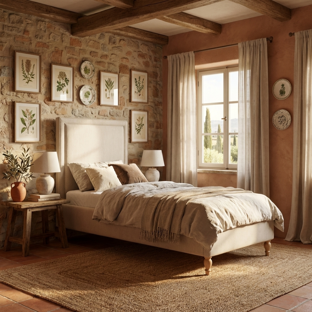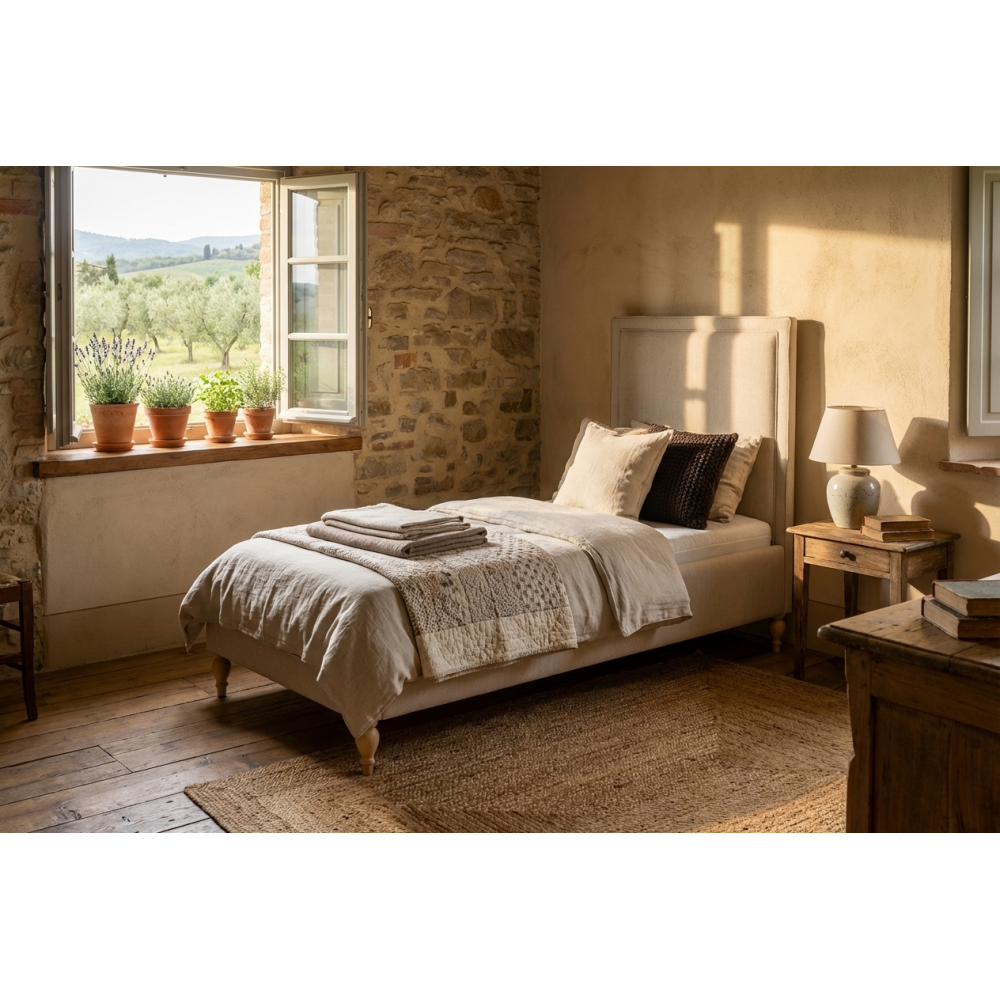 To łóżko to doskonała baza dla każdego, kto kocha styl rustykalny lub marzy o sypialni w klimacie cottage. Neutralna paleta barw sprawia, że mebel jest niezwykle wdzięczny w aranżacji; wystarczy kilka lnianych poduszek i wełniany koc, by stworzyć wnętrze pełne ciepła. Tkanina obiciowa jest nie tylko miła w dotyku, ale też trwała, co daje pewność, że łóżko będzie cieszyć oko przez długie lata, zachowując swój nienaganny wygląd mimo codziennego użytkowania.