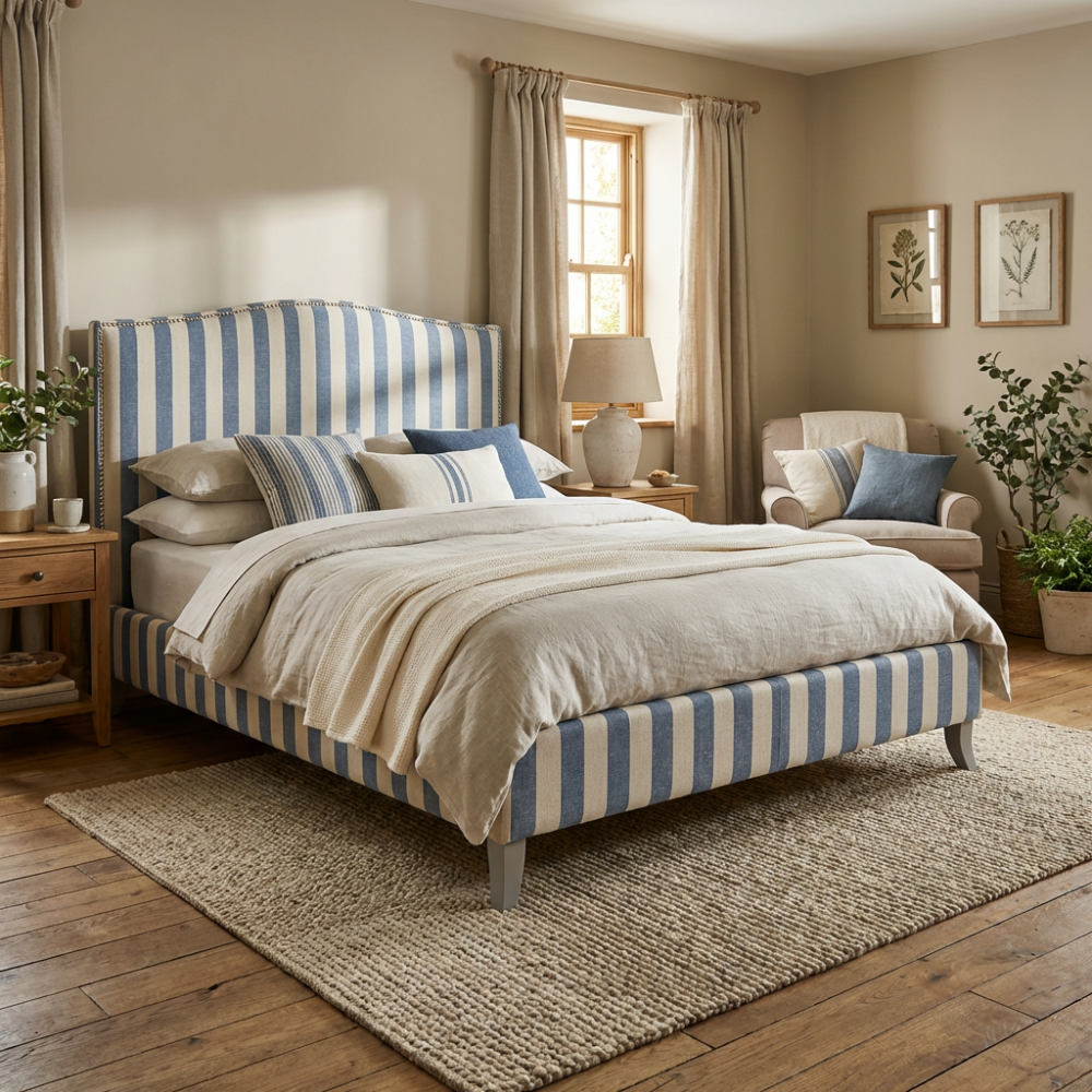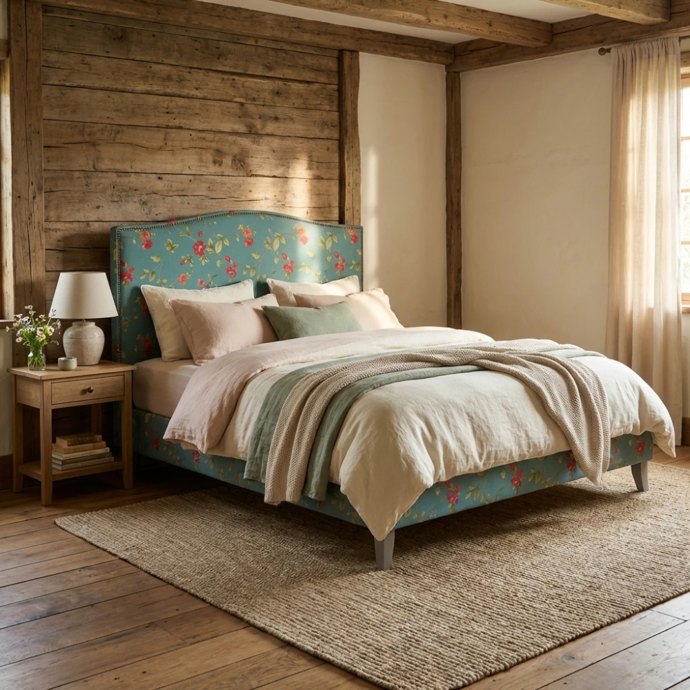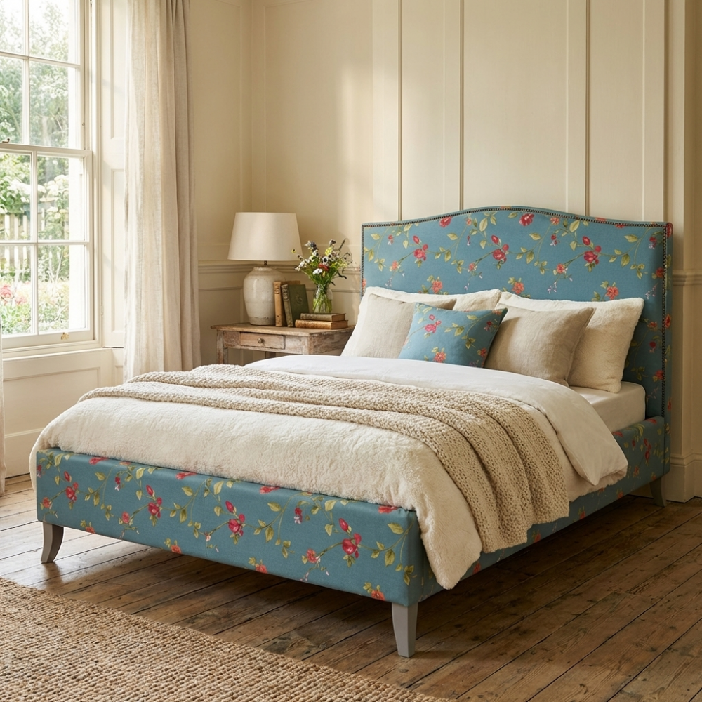 Łóżko zostało osadzone na eleganckich, smukłych nóżkach, które nadają konstrukcji lekkości i pozwalają na swobodną cyrkulację powietrza pod meblem. Dzięki temu, mimo bogatego wzoru, łóżko nie przytłacza nawet mniejszych sypialni. Florystyczny motyw na błękitnym tle fantastycznie komponuje się z naturalnymi materiałami, takimi jak drewniane ściany, lniana pościel czy wełniane narzuty w kolorach ziemi, tworząc harmonijną i kojącą przestrzeń.