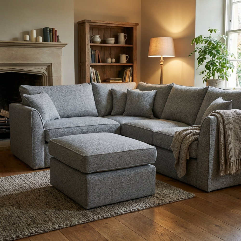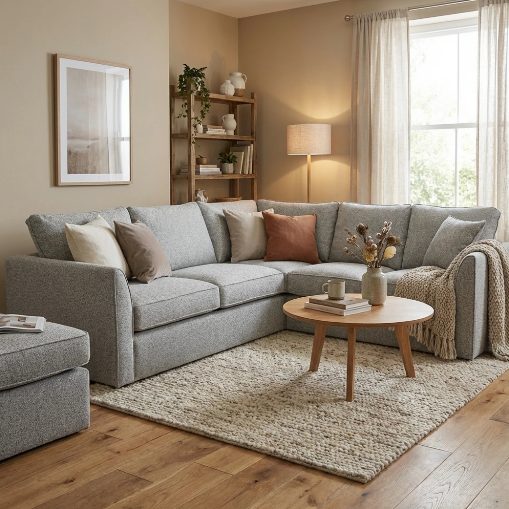 Komfort użytkowania narożnika Mare wynika z zastosowania nowoczesnych wypełnień, które gwarantują optymalną miękkość przy zachowaniu odpowiedniej sprężystości. Niskie, szerokie oparcia oraz głębokie siedziska pozwalają na swobodne biesiadowanie lub popołudniową drzemkę w komfortowych warunkach. Szary, melanżowy odcień tapicerki jest niezwykle praktyczny i łatwy w aranżacji, stanowiąc doskonałą bazę dla dodatków w kolorach ziemi, takich jak miedziane poduszki czy wełniane koce widoczne na zdjęciu.