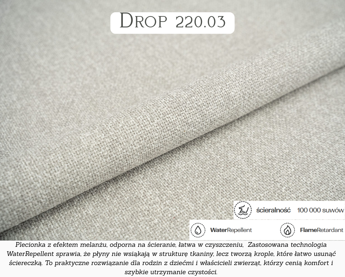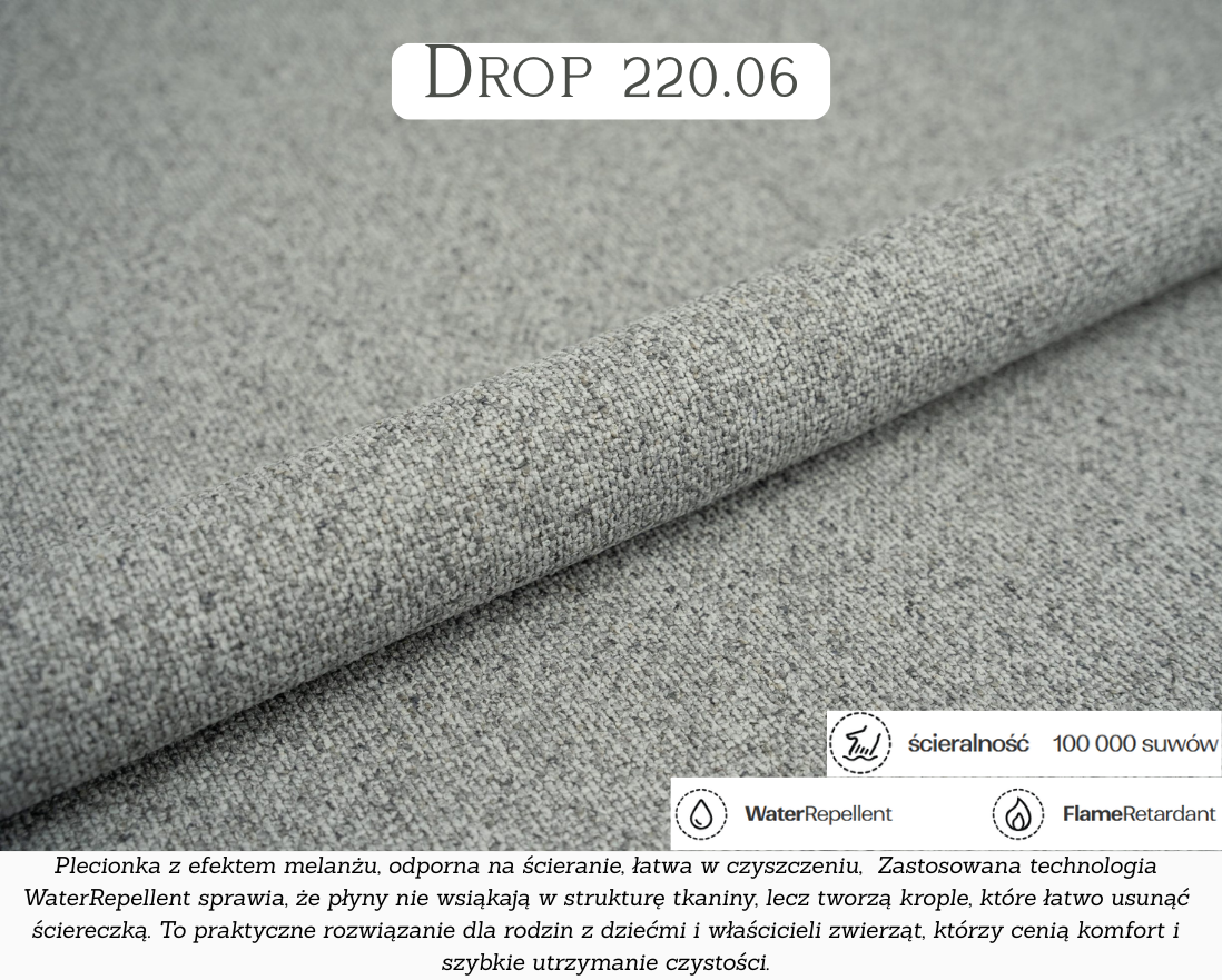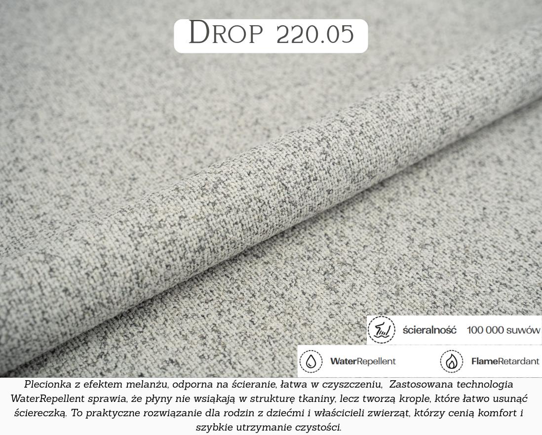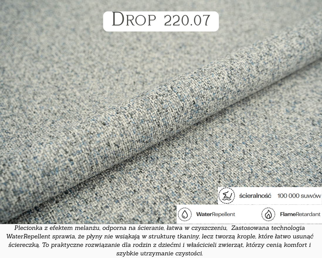 Kluczowym elementem wyróżniającym ten model jest zastosowana tkanina Drop 220.07. Jest to gruba plecionka z efektem melanżu, która dzięki przeplataniu nitek o różnych odcieniach tworzy trójwymiarową, ciekawą wizualnie strukturę. Materiał ten jest niezwykle trwały i odporny na codzienne użytkowanie, a jego mięsistość sprawia, że narożnik Mare staje się niezwykle miły w dotyku. Wybierając ten produkt na meblefox.com, inwestujesz w rzemiosło, które stawia na detale – od precyzyjnych przeszyć po idealne spasowanie poszczególnych modułów.