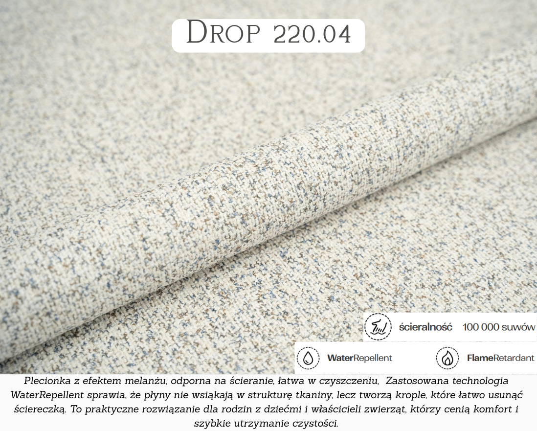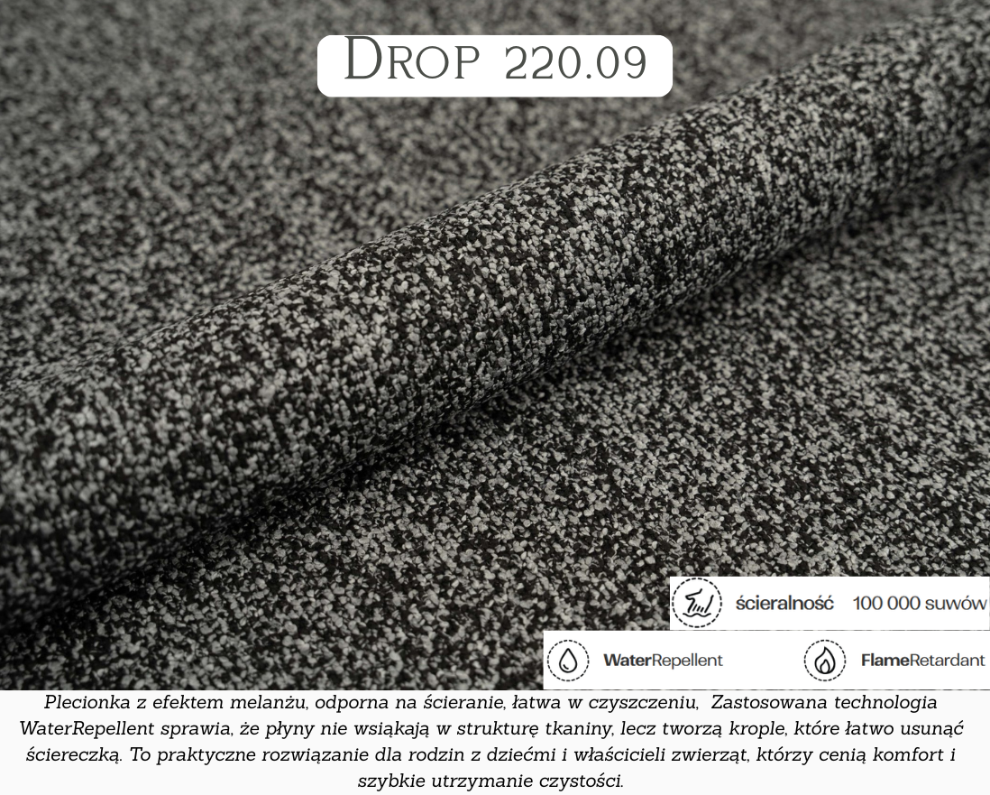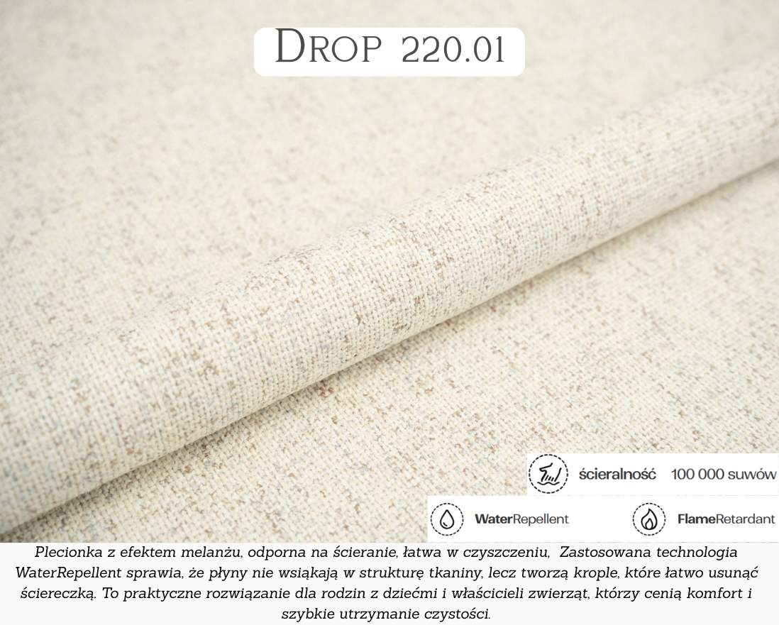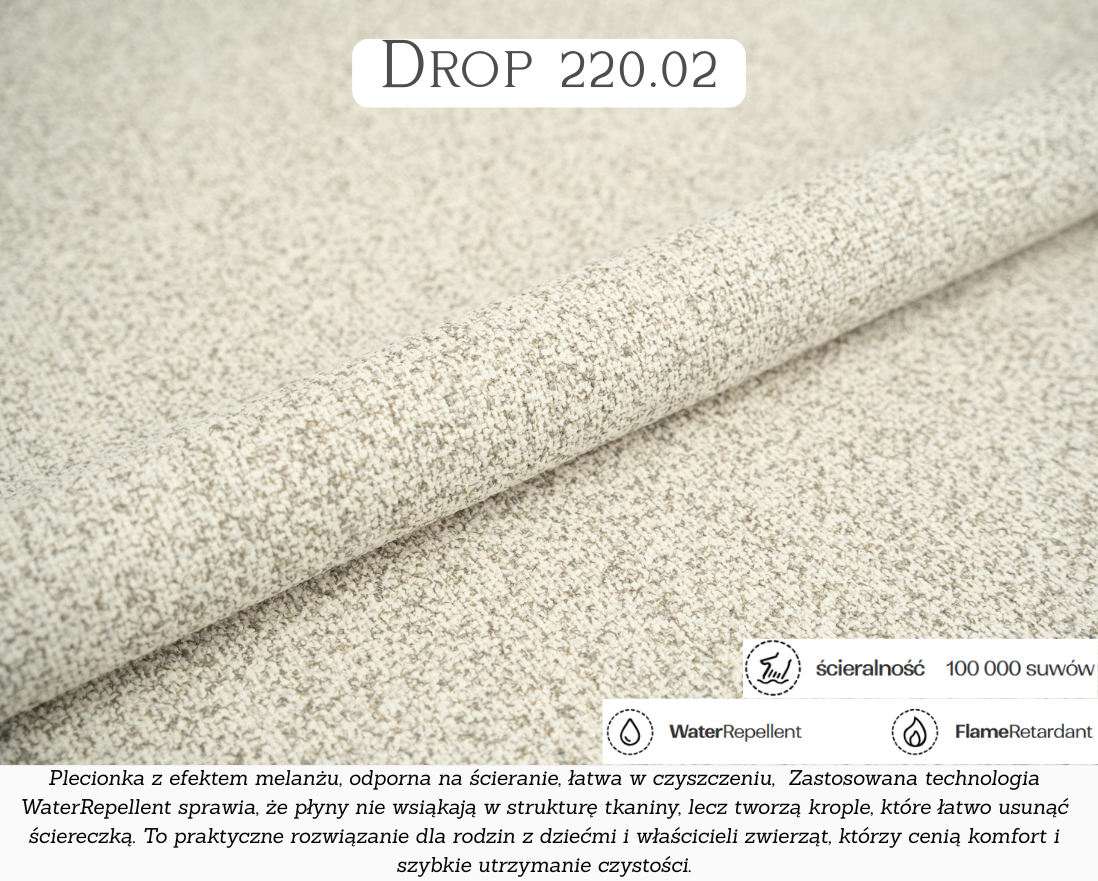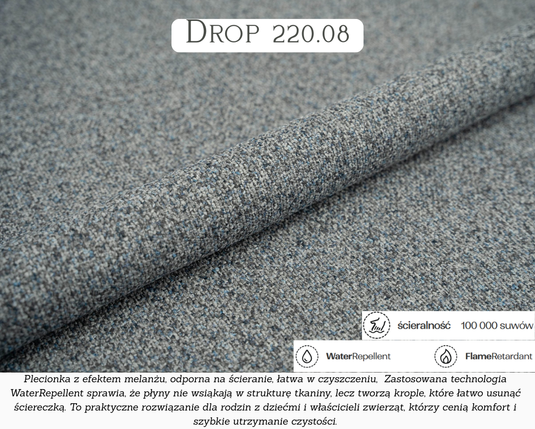Kluczowym elementem wyróżniającym ten model jest zastosowana tkanina Drop 220.07. Jest to gruba plecionka z efektem melanżu, która dzięki przeplataniu nitek o różnych odcieniach tworzy trójwymiarową, ciekawą wizualnie strukturę. Materiał ten jest niezwykle trwały i odporny na codzienne użytkowanie, a jego mięsistość sprawia, że narożnik Mare staje się niezwykle miły w dotyku. Wybierając ten produkt na meblefox.com, inwestujesz w rzemiosło, które stawia na detale – od precyzyjnych przeszyć po idealne spasowanie poszczególnych modułów.