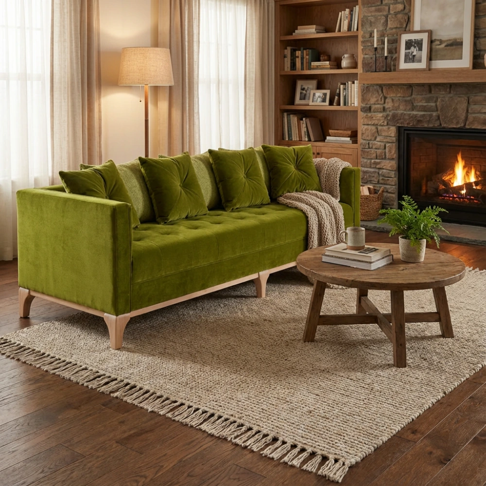 - klasyczna pikowna kanapa w szlachetnym pluszu w odcieniu butelkowej zielenie