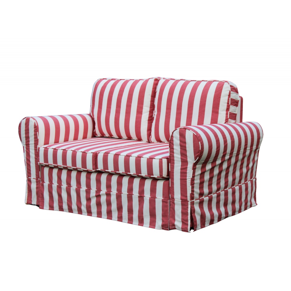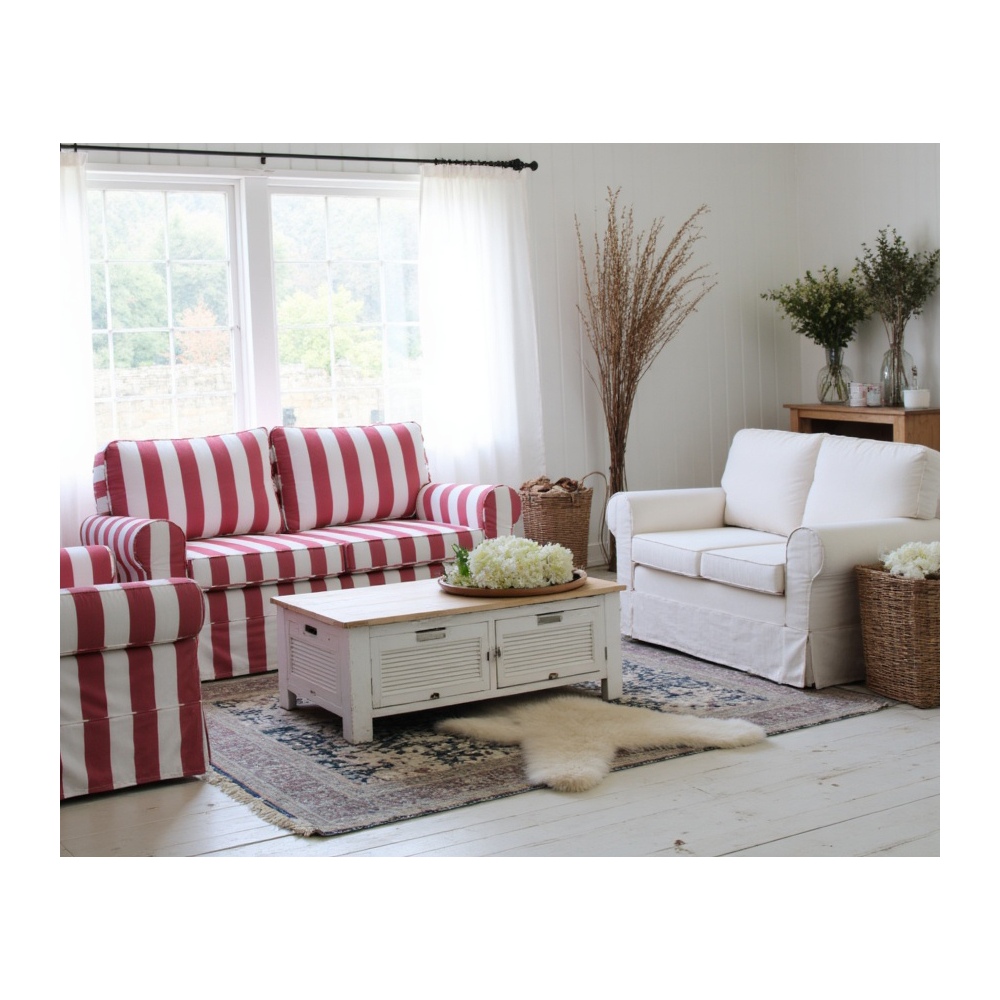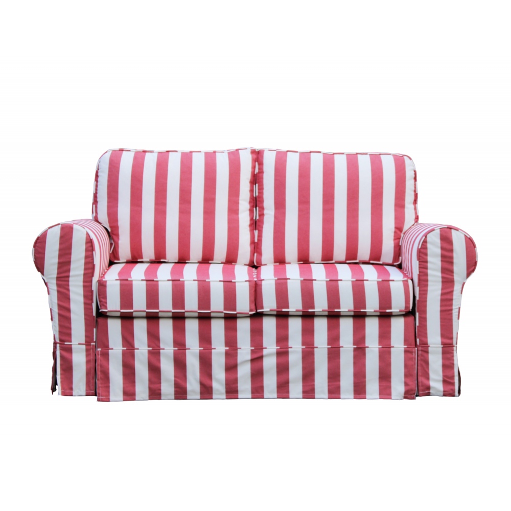 Jej tkanina w szerokie czerwone pasy przyciąga wzrok i tworzy radosną, swobodną atmosferę – idealną do wnętrz w stylu nadmorskim, retro lub eklektycznym. Miękkie poduchy, klasyczne kształty i pokrowiec z lamówką nadają kanapie przytulnego, domowego charakteru.