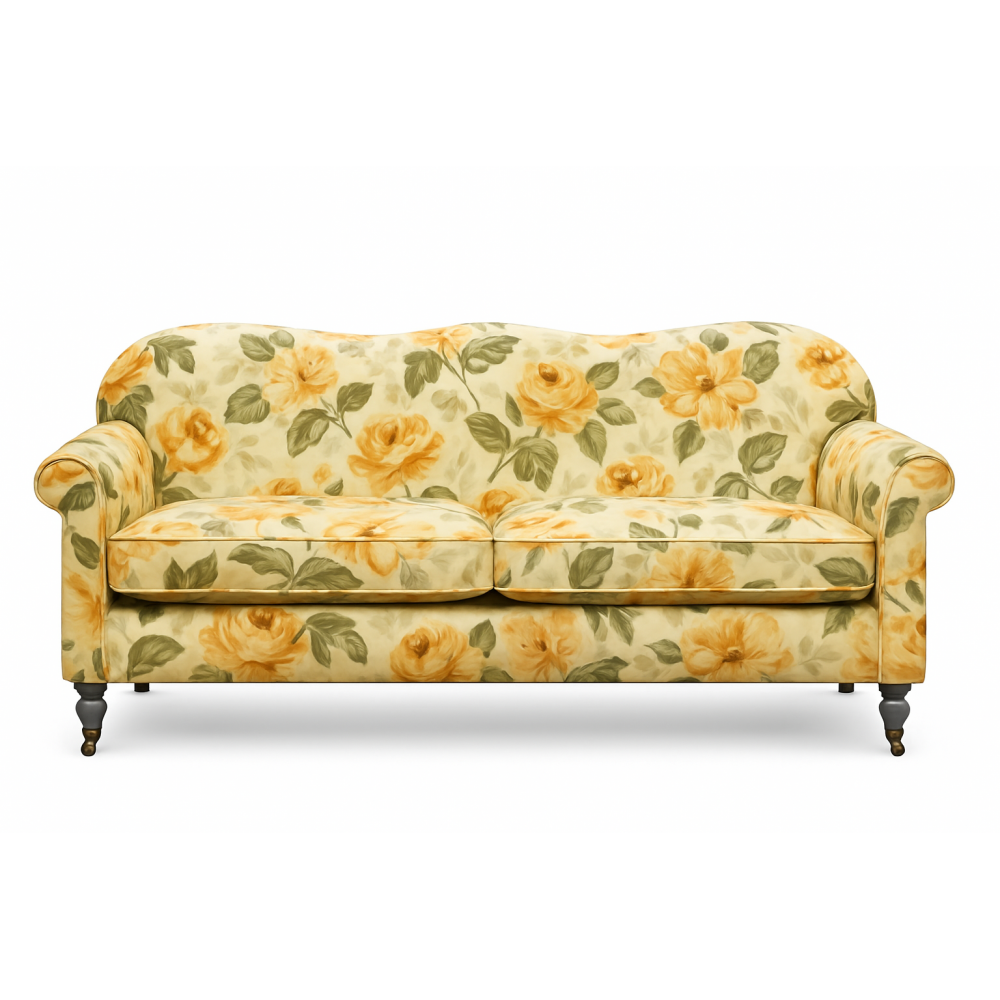 Obicie w kwiatowy wzór wnosi do wnętrza świeżość i lekkość, nawiązując do klasyki stylu angielskiego i New England. Tkanina jest przyjemna w dotyku, odporna na codzienne użytkowanie, a przy tym dodaje wnętrzu wyjątkowego charakteru – sprawiając, że kanapa staje się centralnym punktem salonu.