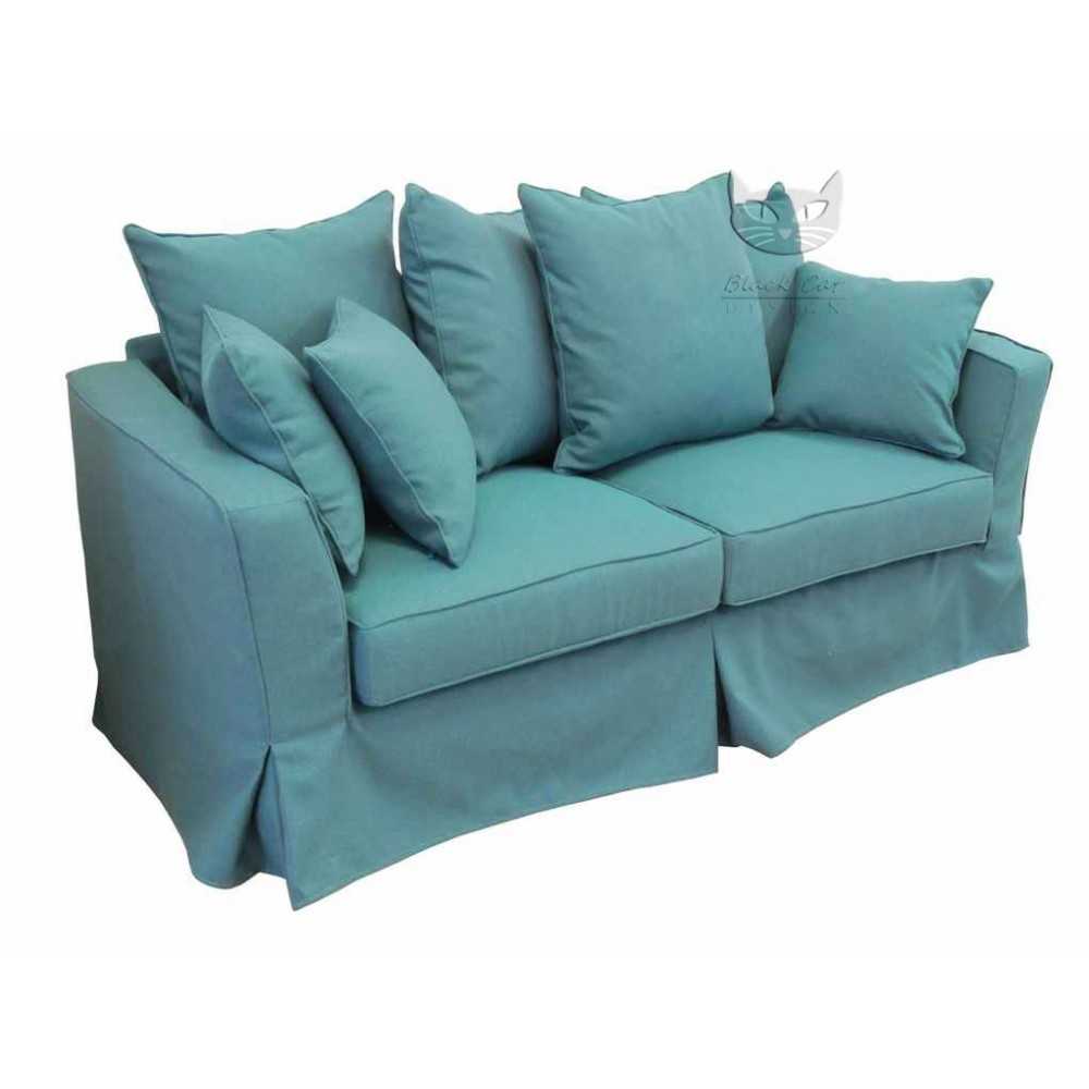 Turkusowa kanapa do salonu Vivienne 190 to niezwykle urocza sofa w stylu angielskim z pokrowcem w wyrazistym, turkusowym kolorze. Sofa sama w sobie stanowi wspaniałą ozdobę każdego salonu. Jest dość obszerna (szerokość 190 cm), dzięki czemu pomieści trzy osoby. Sofa Vivienne 190 przypadnie do gustu miłośnikom stylu klasycznego i angielskiego, ale dzięki intensywnemu kolorowi będzie pasować także do nowoczesnego mieszkania. Sofa ma bardzo miękkie i wygodne siedziska oraz oparcia złożone z mnóstwa wygodnych poduszek. Szerokie boki dają wytchnienie dla zmęczonych nadgarstków i dłoni. Pokrowiec sofy Vivienne 190 można całkowicie zdjąć i wyprać w pralce, dzięki czemu nie straszna jej żadna plama.