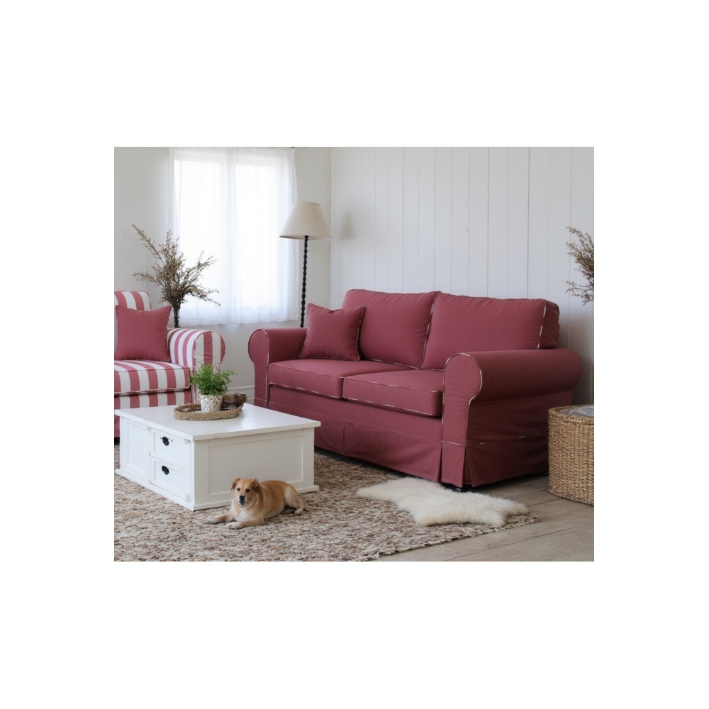 Delikatna linia podłokietników, miękkie siedzisko i luźny pokrowiec z charakterystycznym „fartuchem” tworzą mebel, który idealnie wkomponuje się w jasne, sielskie wnętrza inspirowane południem Francji. Biała tkanina dodaje lekkości i świeżości, a wygodne poduchy zapewniają relaks każdego dnia.
