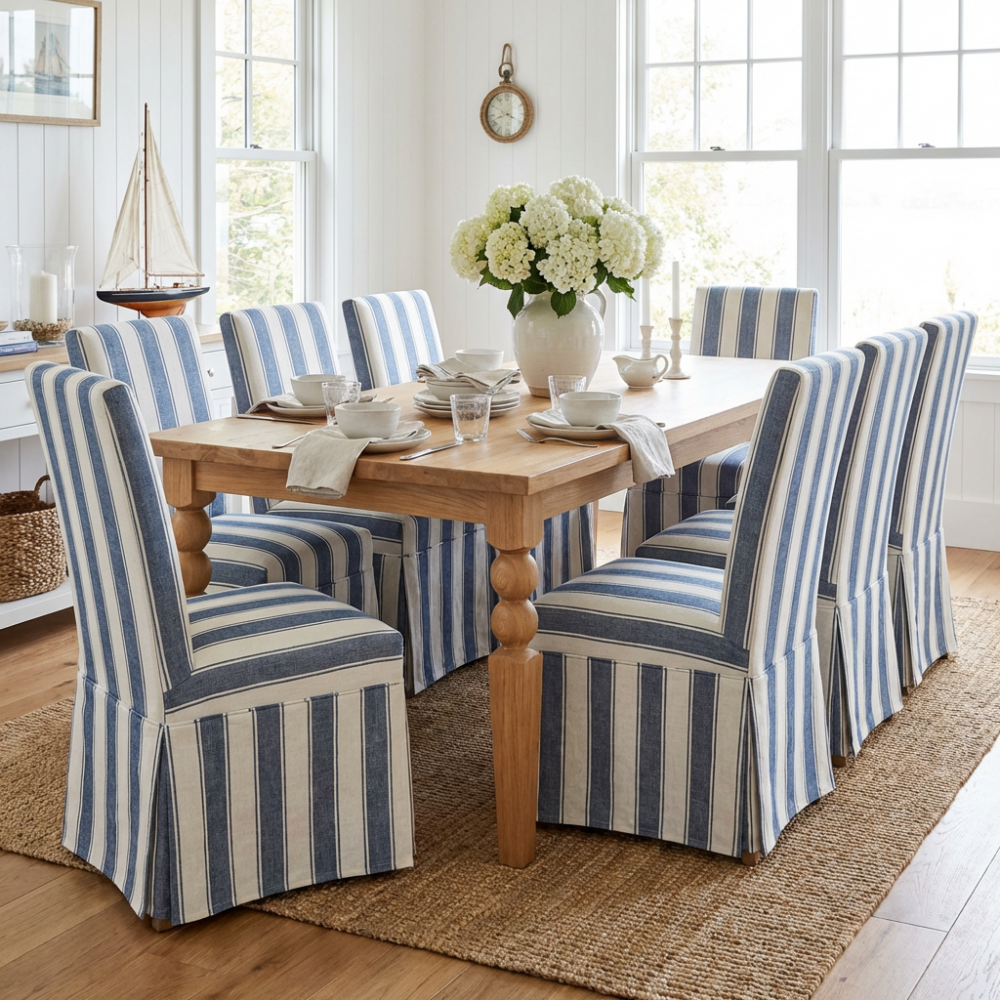 Idealnym dopełnieniem dębowego blatu są krzesła Adriatic, które w tej wersji zostały w całości ubrane w szlachetną tkaninę wykonaną w 100% z naturalnego lnu. Śnieżnobiała tapicerka w połączeniu z eleganckim wykończeniem typu "spódniczka" nadaje jadalni lekkości i wyjątkowego, nadmorskiego sznytu. Len, jako materiał szlachetny i ekologiczny, zapewnia niezrównany komfort użytkowania – jest niezwykle miły w dotyku, pozwala skórze oddychać i z biegiem lat nabiera jeszcze szlachetniejszego wyglądu, co podkreśla prestiż całego zestawu.