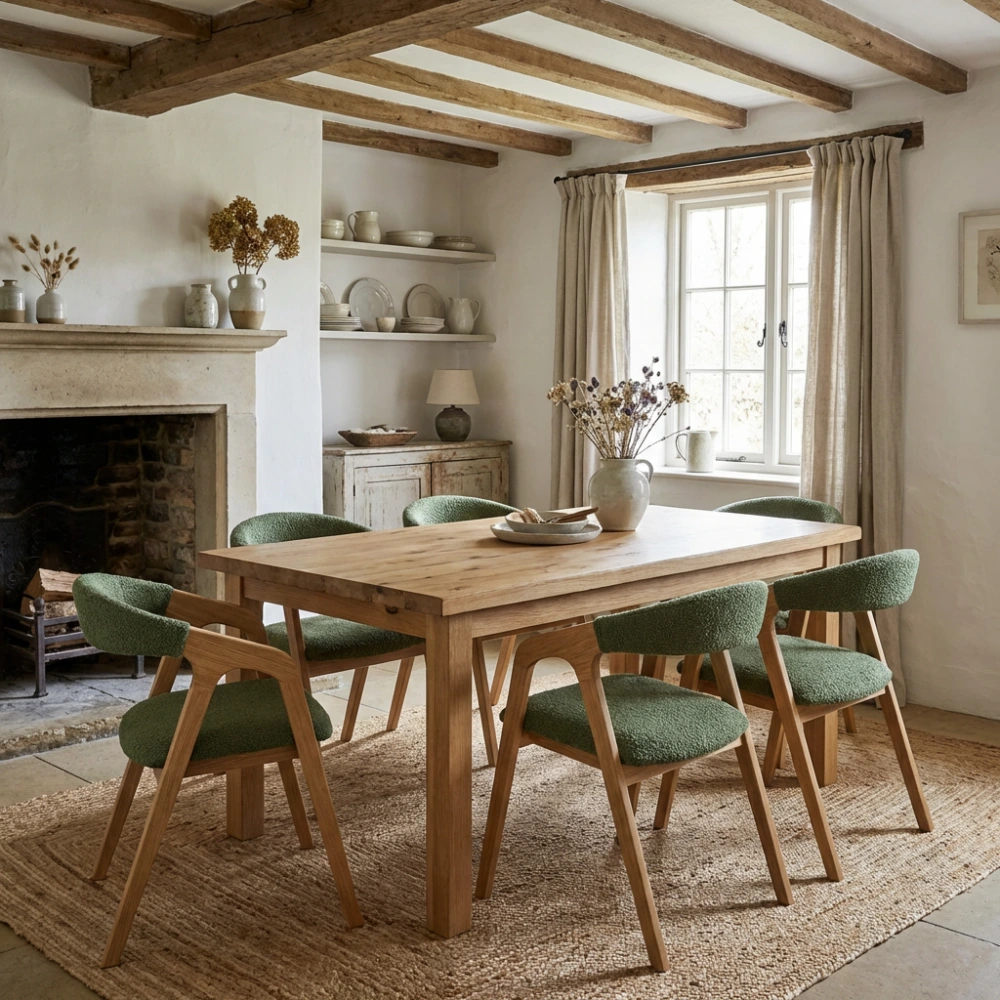 Idealnym dopełnieniem dębowego blatu jest zestaw sześciu krzeseł Eri, które stanowią kwintesencję nowoczesnej ergonomii i oryginalnego stylu. Krzesła te wyróżniają się dynamicznym, dębowym stelażem o geometrycznych liniach oraz luksusową tapicerką w odcieniu szałwiowej zieleni o teksturze typu boucle. Miękkie, kubełkowe oparcia otulają ciało, zapewniając niezrównany komfort podczas długich biesiadowania, a ich unikalny kolor wprowadza do wnętrza powiew świeżości i elegancji inspirowanej kolorami ziemi.